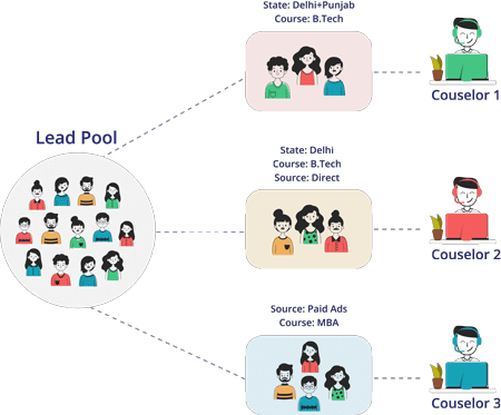 Once all your leads are centralised, they can be allocated to your counselors dynamically based on custom business logic or in a simple round-robin fashion. Your logic can be a mix of geographic details, course preferences, or the source of the enquiry – so no two counsellors get the same lead to nurture. Say goodbye to duplications and hello to cost optimisation!