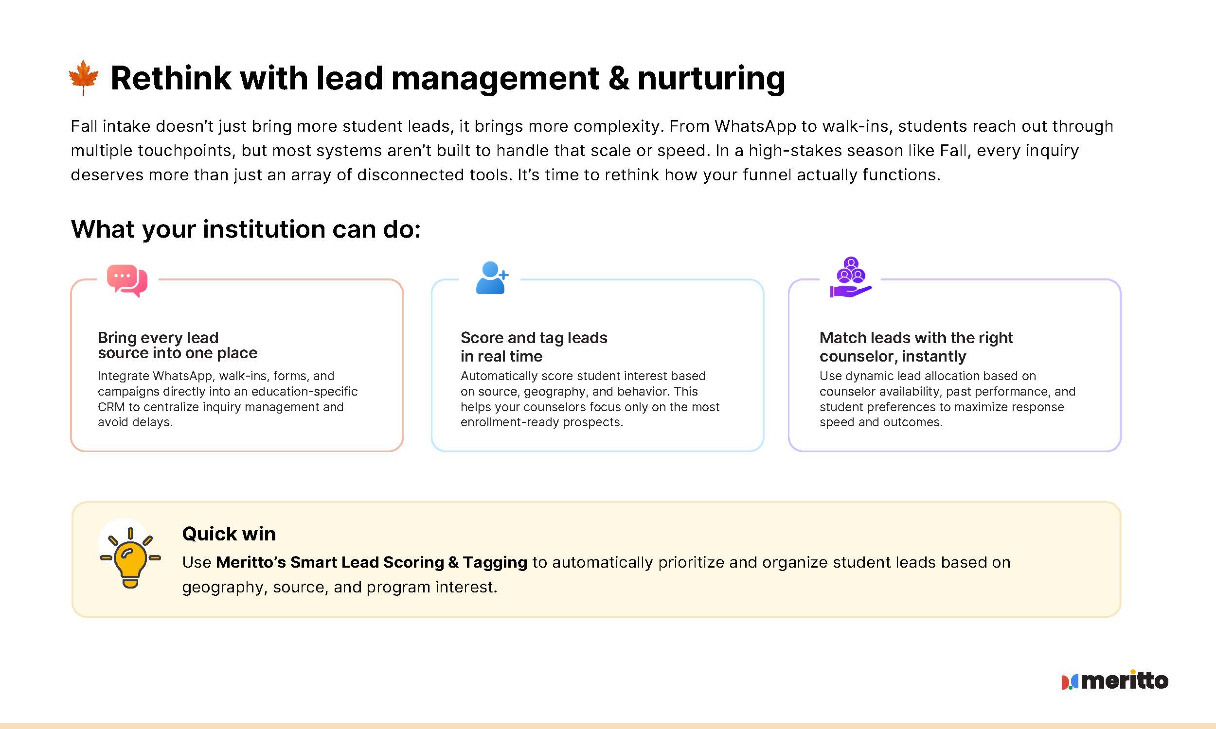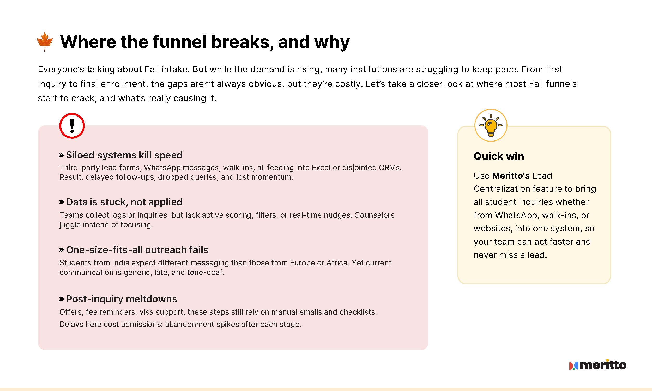 - Where Fall funnels break: from siloed lead capture to post-application delays.