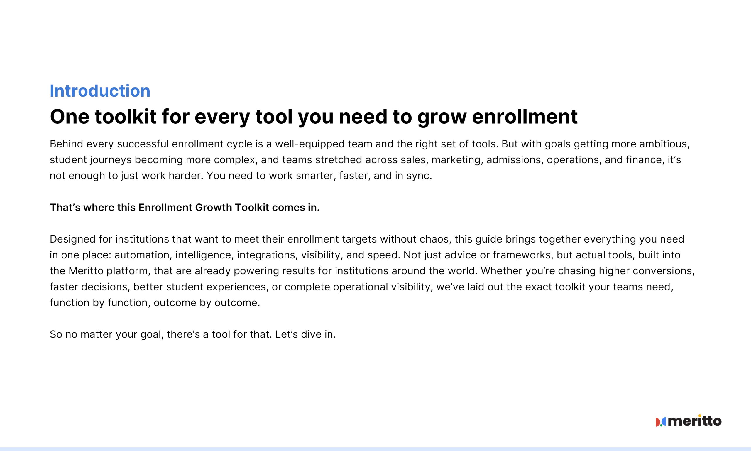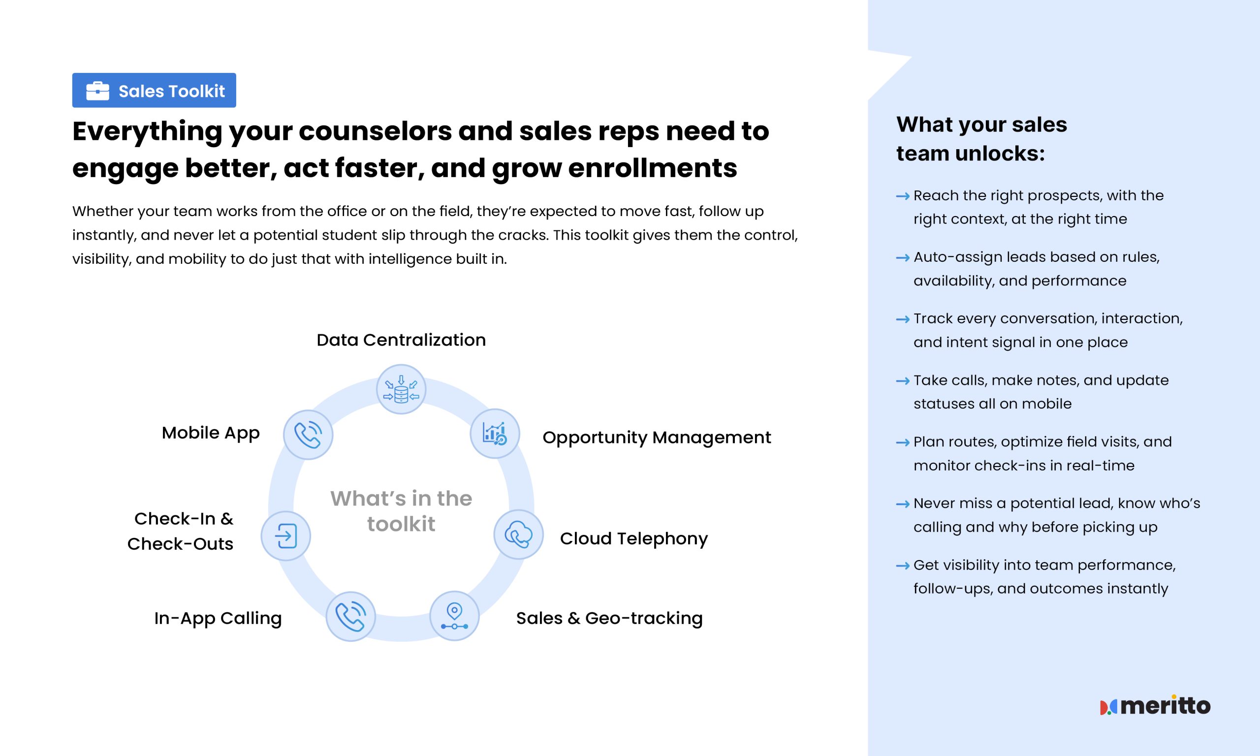Meritto is a de-facto choice for all educational organizations looking to grow their enrollments, as it equips their Sales, Marketing, Admission, Finance, and Operation teams to be more productive with its powerful yet easy-to-use solutions. All their products from Enrollment Cloud, Education CRM, Application Platform, and Education Chatbot, to Payment Cloud, are purpose-built to keep educational organizations enrolling.